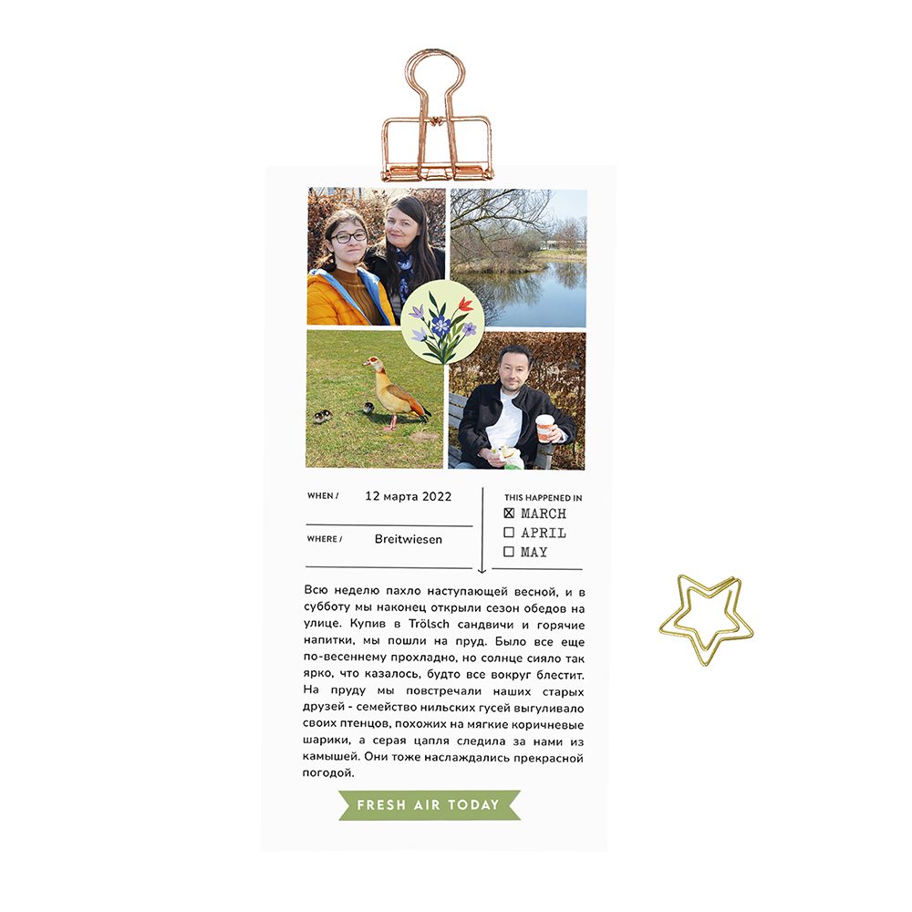 To visually unite all four images, I added a round floral tag right at their intersection point. It acts almost like a soft focal anchor, gently tying the photos together and preventing the grid from feeling too rigid. The circular shape also contrasts nicely with the square format, adding movement and flow to the composition. Beneath the photo block, I placed a ready-made stamp from the kit where I recorded the date and location of our picnic and marked March with a small cross. I love including these tiny documentary details — they ground the page in a real moment in time. Below that, I added my journaling and finished the page with the green wordbit “fresh air today.” It felt like the perfect closing note — simple, honest, and exactly what that day was about.