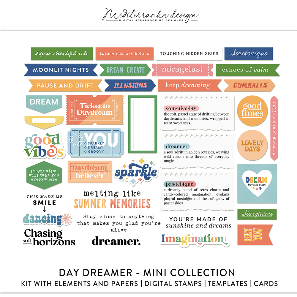Step into a soft retro daydream with this playful digital mini collection inspired by color, imagination, and nostalgic joy. Day dreamer is designed for creatives who love whimsical hand-drawn details, pastel energy, and expressive storytelling through scrapbooking and journaling. Ideal for digital scrapbooking, printable projects, creative journaling, planners, memory keeping, and DIY paper crafts, this set blends playful nostalgia with modern creativity. Designed to be easy to mix, layer, and personalize, Day dreamer fits effortlessly into creative workflows for beginners and experienced crafters alike.