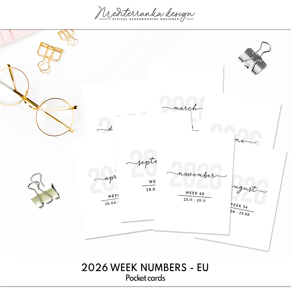 Stay organized and inspired all year long with these 2026 week numbers digital journaling cards. Each card is designed with a clean and minimal look, making it easy to track weeks, plan projects, or document your memories in a clear and structured way. Perfect for digital planners, journaling, scrapbooking, or memory-keeping, these cards are a practical and creative addition to your digital workspace. Use them as weekly dividers, overview cards, or accents in your layouts to keep your projects beautifully organized. Ideal for anyone who loves digital journaling, planning, or creative design. A great tool to bring more structure and style into your year!