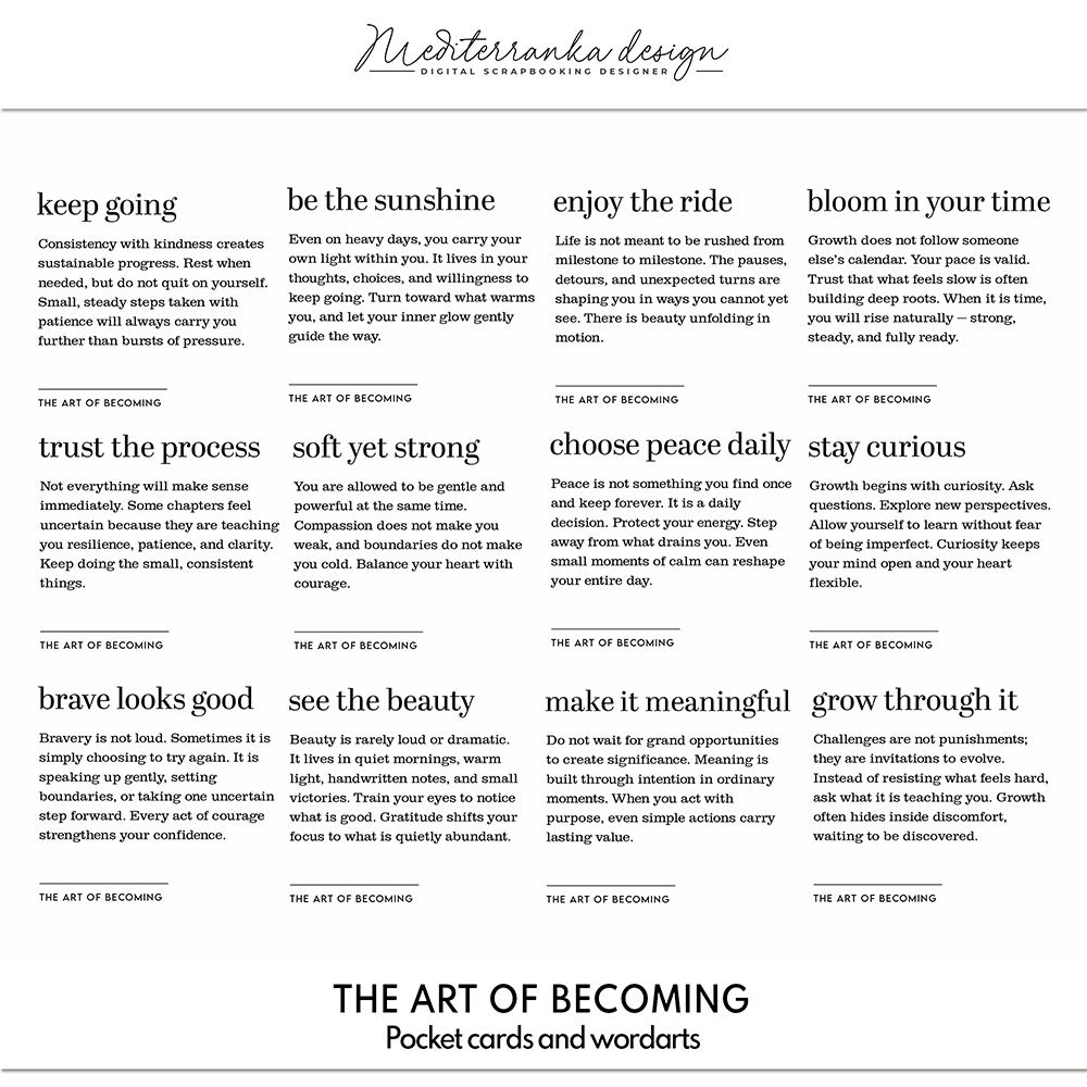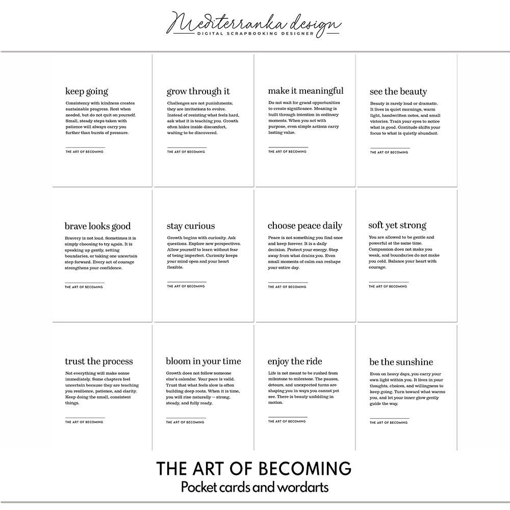 This set of 12 digital journaling cards is designed to inspire intentional living, self-growth, and daily reflection. Each card features a powerful title and a thoughtfully written affirmation to encourage mindfulness, confidence, and inner strength. Perfect for printable journaling, scrapbooking, planners, vision boards, or self-care routines, these inspirational quote cards bring calm motivation to your everyday life. Ideal for women who value personal development, aesthetic stationery, and meaningful paper goods, this collection adds depth and elegance to any creative project.