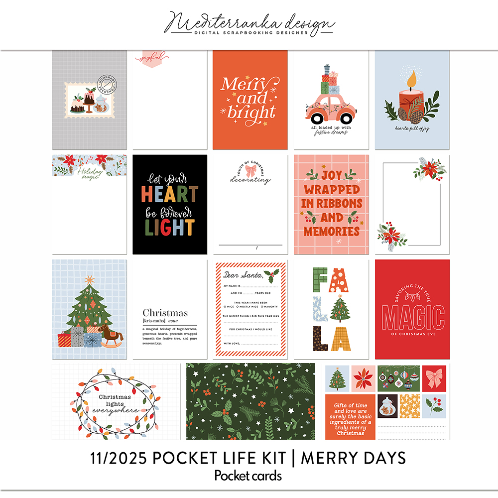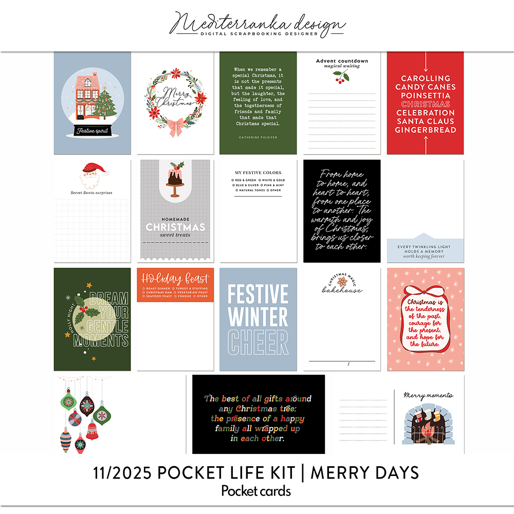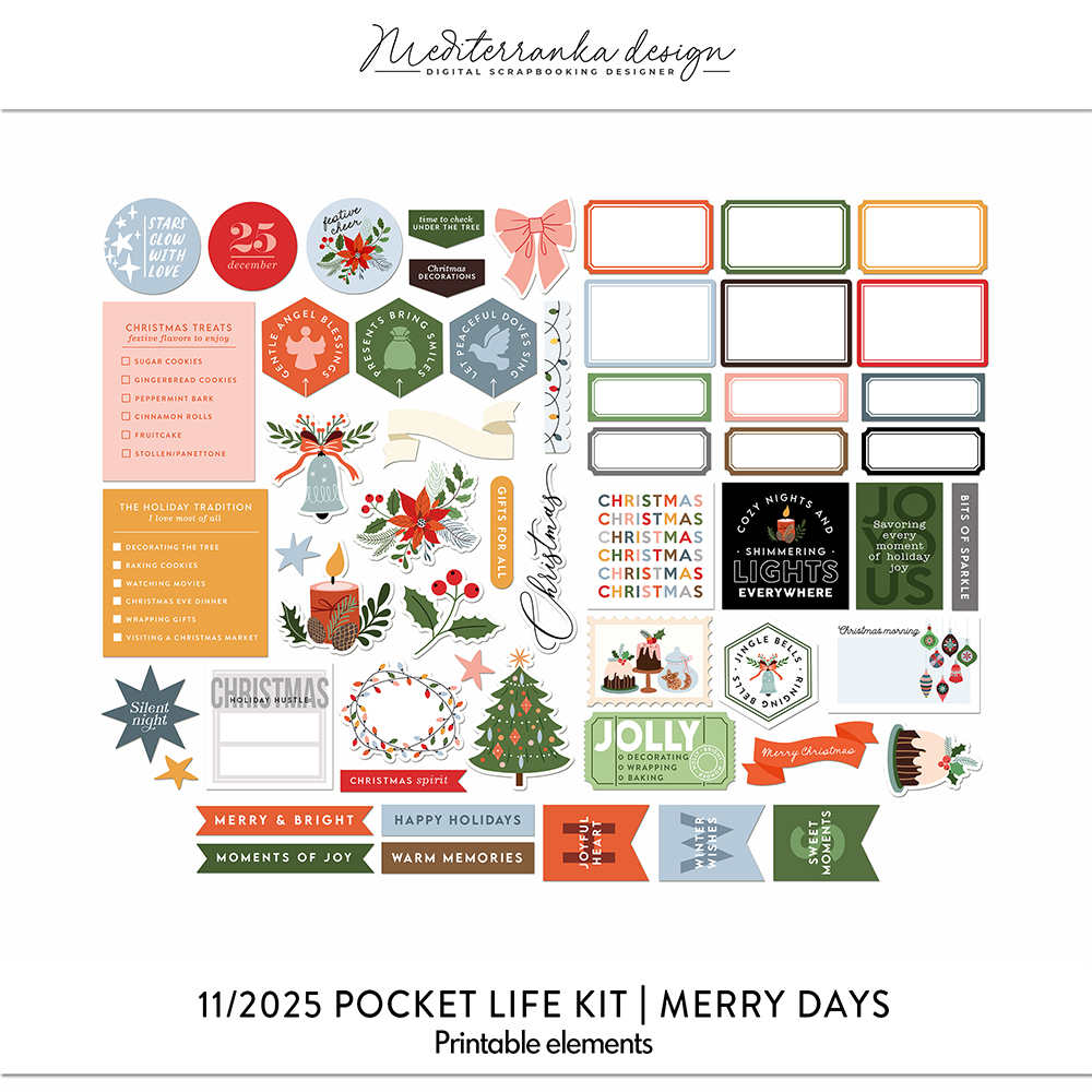 Celebrate the joy of the holiday season with the Merry Days Digital Pocket Life Kit. This all-in-one festive collection includes digital journaling cards, charming digital stamps, playful printable elements, patterned papers, and printable gift tags, making it perfect for scrapbooking, memory keeping, planners, holiday crafts, and creative projects. Each element captures the magic of Christmas with cheerful designs, cozy seasonal colors, and whimsical holiday motifs. Ideal for crafters, scrapbookers, and memory keepers, the Merry Days Digital Pocket Life Kit provides everything you need to document your holiday memories, create beautiful Christmas spreads, and add a personal touch to every festive project.