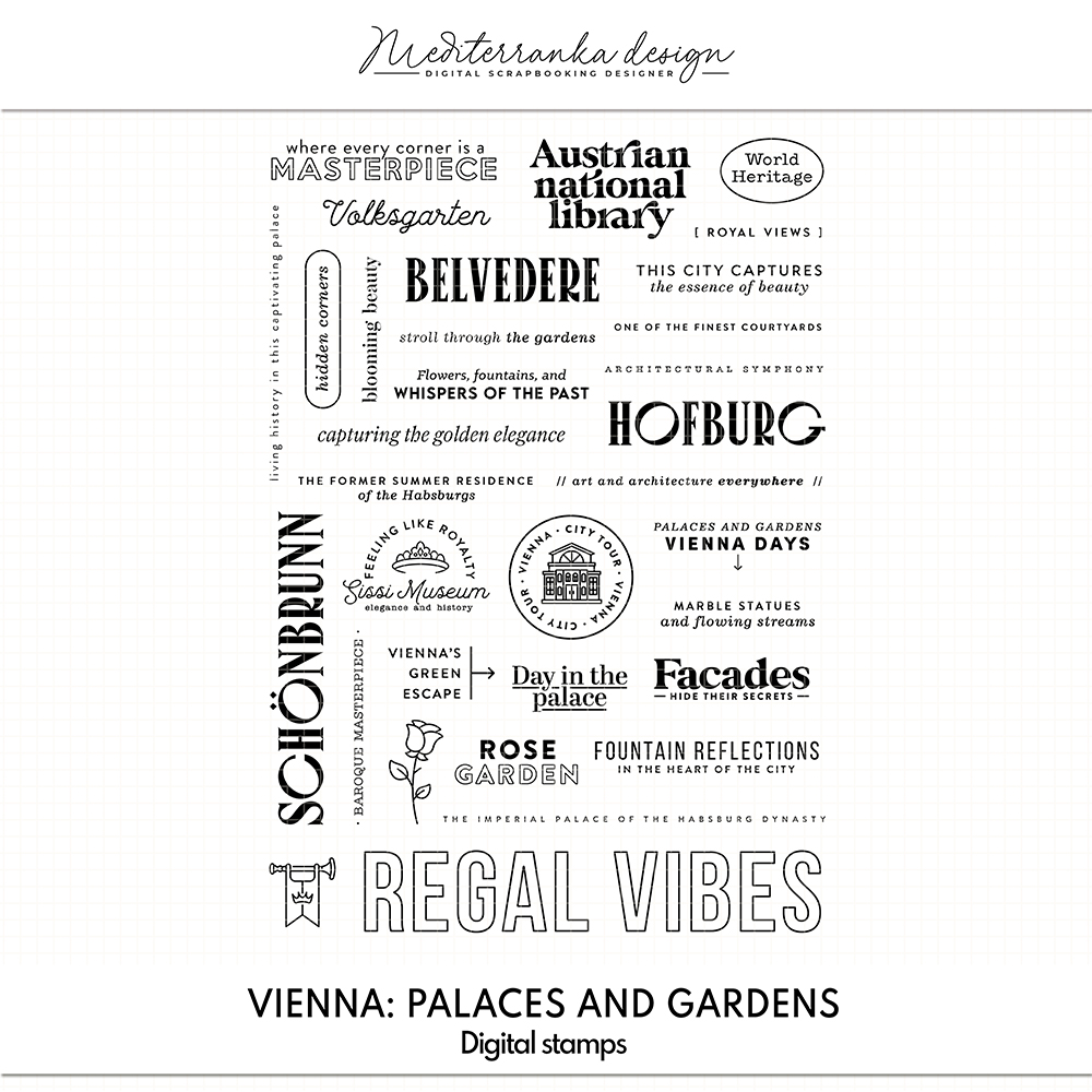 This set of stamps is inspired by the city’s grand architecture, romantic palaces, and beautifully landscaped gardens, perfect for adding a touch of European sophistication to your designs. Ideal for scrapbooking, journaling, card making, planners, or DIY crafts, these digital stamps can be resized and combined to suit your projects. Whether you want to capture a refined atmosphere or highlight travel memories, this set offers timeless charm and versatility for your creative collection. This set includes 33 digital stamps.